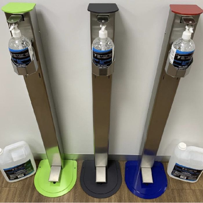 - Our hand sanitizing dispensers are made from stainless steel and aluminum